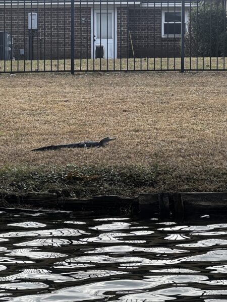 A small alligator has been spotted on the bank of our lake. It has moved south along the eastern leg of the lake. Please use caution when in your backyards and when dogs are out.